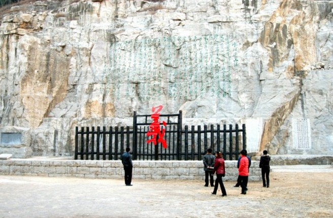《水泊梁山記》是著名書畫大師范曾2002年專為水泊梁山風(fēng)景區(qū)撰寫。先生懷著對英雄故里的一腔深情,慷慨揮毫、步其先人范仲淹《岳陽樓記》韻,全文368字,描述了水泊梁山河岳闊峻、草木蕭森的雄奇景象。《水泊梁山記》大型摩崖石刻,通高7米、長14米,距地面10余米,單字最大55厘米見方,最小字30厘米見方,通篇368字占地近100平方米,氣勢恢弘、蔚為大觀,形成了南有《岳陽樓記》、北有《水泊梁山記》的文化格局。為旅游勝地水泊梁山再添景觀,現(xiàn)為水泊梁山風(fēng)景區(qū)的主要景點(diǎn)之一。與梁山粗獷豪放的山體及周圍環(huán)境交融,深化了景區(qū)的水滸文化內(nèi)涵,成為進(jìn)入梁山風(fēng)景區(qū)山寨景區(qū)的標(biāo)志性景觀,其所在廣場,亦成為在梁山舉行的與水滸、旅游有關(guān)的大型集會的場所之一。