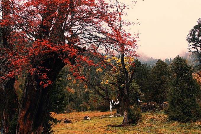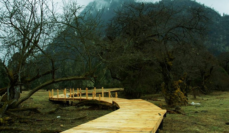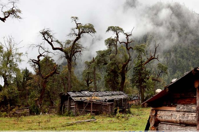 溝谷兩側,林木參天,青岡、云杉、樺樹、柏木翠綠幽深;淡黃色的松蘿,從高大的樹叉枝丫間垂下,有如童話劇中仙女的帷幔;林間草木繁茂,野花搖曳,紅色,黃色,嬌艷欲滴,嫵媚動人;湍急的南伊曲水在谷間轟然鳴響,翻騰的浪花晶瑩剔透,潔白如玉;路邊擱置的巨大圓木,靜靜地躺在野草花之中,訴說著一段古老與滄桑……