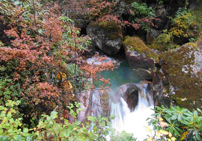 瀑布三層相疊,落差高達400米,又名“三疊泉”。層疊一層,落差高達400余公尺。它穿云越霧,由山巔奔騰飛瀉,跌落于幽河深谷。多層瀑布的最上層,是從高入云霄的雪峰中直瀉而下,激起滿谷的蒙蒙水氣,“隆隆水聲”在整個山谷轟鳴。第二層瀑布水勢急,瀑面寬大,從高處的綠樹叢中緩緩流出,然后急瀉而下。最下層斜沖到一巨石上,曲折而瀉,直至多雄拉河,形成一個個深潭。多層瀑布由于落差大,陽光一照,瀑邊映出一條條五彩繽紛的彩虹,將河谷兩岸的風光打扮得格外絢麗。