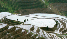從流水湍急的河谷,到白云繚繞的山巔,從萬(wàn)木蔥蘢的林邊到石壁崖前,凡有泥土的地方,都開辟了梯田。垂直高度五六里,橫向伸延五六里。那起伏的、高聳入云的山,蜿蜓的一級(jí)一級(jí)登上藍(lán)天。梯田,像天與地之間一幅幅巨大的抽象畫。每個(gè)看見這一景色游客的心靈都會(huì)被深深地震撼,這是一種難以言表的,一種被大自然的雄奇以及人的偉力所引起的震撼。 這里一年四季景觀各異,春來(lái),水滿田疇,如串串銀鏈山間掛;夏至,佳禾吐翠,似排排綠浪從天瀉;金秋,稻穗沉甸,像座座金塔頂玉宇;隆冬,瑞雪兆豐年,若環(huán)環(huán)白玉砌云端。這種景象稱得上是人間一大奇觀。有趣的是,在這浩瀚如海的梯田世界里,最大的一塊田不過(guò)一畝,大多數(shù)是只能種一二行禾的碎田塊,因此有“蓑衣蓋過(guò)田”的說(shuō)法。
