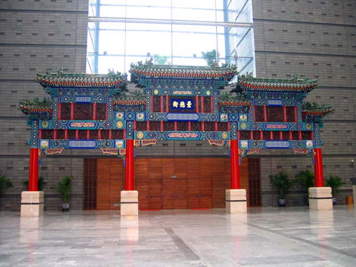 首都博物館建筑本身是一座融古典美和現代美于一體的建筑藝術品,既具有濃郁的民族特色,又呈現鮮明的現代感。巨大的屋蓋繼承了中國傳統建筑深遠挑檐;通長的石質幕墻象征著中國古代城墻;版權所有山東聊城聊之旅國際旅行社有限公司,轉載必究!廣場起坡傳承古代高臺建筑風格;在大廳北門外地面上鑲嵌清代丹陛,大廳內有明代牌樓,體現出中國傳統建筑平面中心軸線特點;橢圓形的青銅展館斜出墻面寓意古代文物破土而出。青銅、木材與磚石的大量運用更顯一種歷史的久遠。北廣場和大堂地面所用石材,產于自古以來為營造北京城供應石材的房山地區;方形展廳的外裝飾,采用北京最常見的榆木;橢圓形展廳的外裝飾,采用青銅材料,并飾以北京出土的西周時期青銅器的紋樣。鋼結構棚頂、玻璃幕墻等表現出北京有力的時代步伐,高大空間和通透的視覺效果順應了當代建筑的國際流行趨勢。