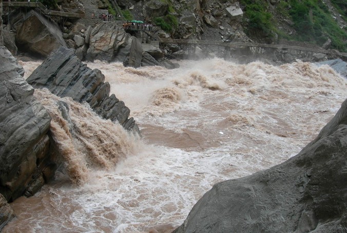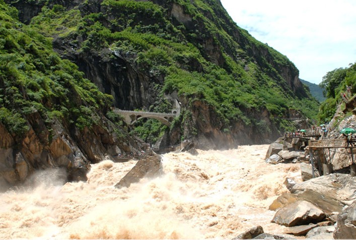 石鼓以下,江面漸窄,至左岸支流碩多崗河口橋頭鎮(zhèn),往東北不遠(yuǎn)即進(jìn)入舉世罕見的虎跳峽。虎跳峽上峽口與下峽口相距僅16公里,落差竟達(dá)220米。平均坡降達(dá)13.8‰,是金沙江落差最集中的河段。峽中水面寬處60米,窄處僅30米并有巨石兀立江中,相傳曾有猛虎在此躍江而過,故名虎跳石,虎跳峽也由此得名。峽內(nèi)急流飛瀉、驚濤轟鳴,最大流速達(dá)10米/秒。峽谷右岸為海拔5596米的玉龍雪山,左岸為海拔5396米的哈巴雪山,兩山終年積雪不化。峽內(nèi)江面不足海拔1800米,峰谷間高差達(dá)3000余米。峽中谷坡陡峭,懸崖壁立,呈幼年期“V”型峽谷地貌。