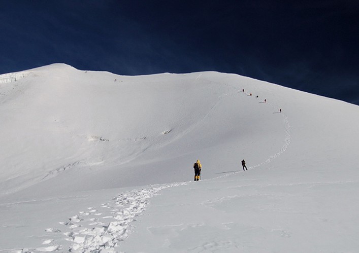 由于該峰各種坡度的地形都有,還有混合地形和垂直冰壁所以適合各種水平的人訓(xùn)練,但初學(xué)者一定不要到超出自己水平的路線上去。1999年西藏隊的十四座隊的主力隊員仁那和加布,還有國際健將丹增多吉帶領(lǐng)二十名奧索卡學(xué)校的學(xué)生在這里進行訓(xùn)練,他們從南面偏東的位置沿著山體直上,平均坡度在50度左右,到頂?shù)臅r候更陡。走直上路線必須修路,山頂一段千萬別離山脊太近,那是雪檐和陡壁。