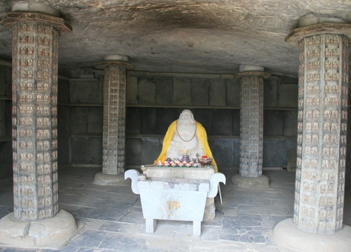 靜琬最初所刻的一百四十六塊石經(jīng)鑲嵌于洞內(nèi)四壁之上。洞中央有四根八角形石柱,每根柱上均有浮雕佛像,共一千多尊,稱千佛柱。由于山洞藏經(jīng)貯滿,遼金時(shí)代續(xù)刻的經(jīng)版就沒(méi)再運(yùn)上山,而藏于云居寺南塔下地穴中。