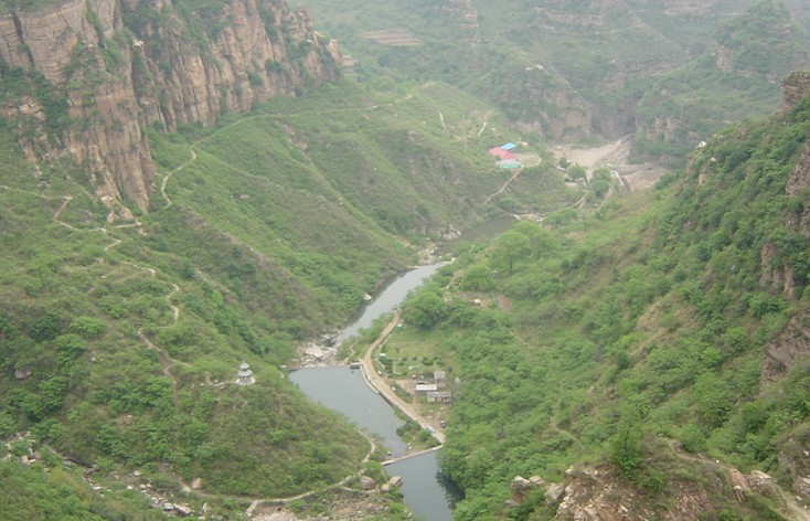 走過這道彎,對面看去的那座山,像一個巨大的手掌,叫做“佛手山”,而站在天河梁再看這座山則像一個巨輪,因此又稱它“太行巨輪”。還可以看到左上方有塊巨石,像微微打開的書在那平放著一樣,叫做“天書”,大自然鬼斧神工般的造物,真是讓人難以捉摸。