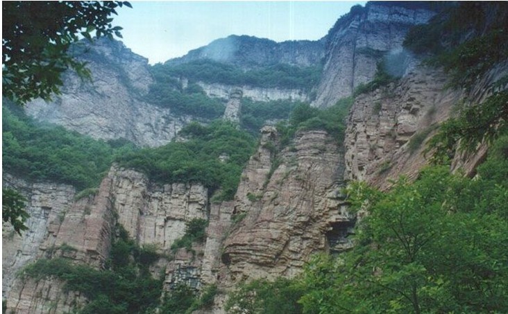 丹霞地貌紅色的奇峰異石與嶂石巖有點(diǎn)相似,但它是由流水整體侵蝕切割形成的,以塊狀結(jié)構(gòu)為主。而嶂石巖地貌則是以延續(xù)不斷的丹崖長墻、彎曲相連的型嶂谷以及一頭開口的峽谷為主要特色,因此認(rèn)定它是一種新的地貌類型,命名為嶂石巖地貌,與丹霞、張家界并列為中國三大砂巖地貌。 嶂石巖這種特殊的形態(tài)與構(gòu)成它的巖石性質(zhì)有關(guān)。這個(gè)堅(jiān)硬的厚層是構(gòu)成它的主要成分--石英砂巖,下面則是一層比較薄、比較軟的泥巖或泥質(zhì)砂巖。