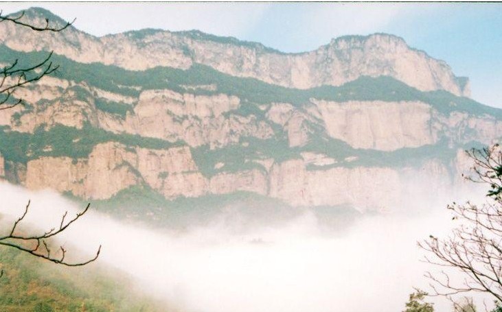 如果誰要是不知“層巒疊嶂”這個(gè)詞的確切含義,就到嶂石巖去讀吧。它的山巒成三疊,每一疊都如紅色屏 嶂石巖風(fēng),高一二百丈,廣數(shù)里,石壁光滑如磨,纖草不生,飛鳥難落,猿猴難攀。每兩疊間錯(cuò)落成平臺(tái),樹茂草豐,呈綠色環(huán)帶。