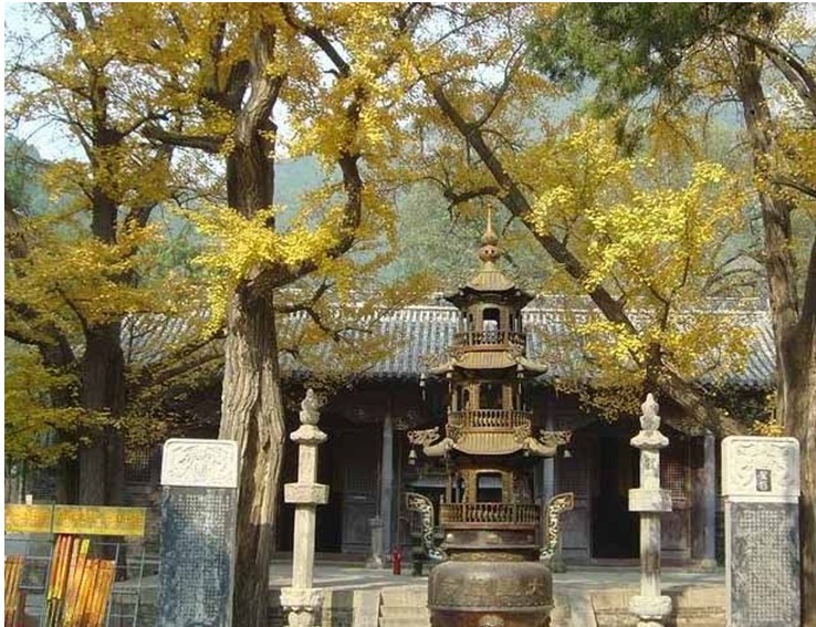 即五峰山,禪林寺古銀杏風景園“三古”之一,這座屹立于燕山叢中的名山,東與名勝舍身臺眺望,西和邊關古隘羅文峪遙對,南臨沙河,北靠長城。五座并峙的峰巒自北向南延伸十數里,禪林寺便建于中峰下端。著名的“五峰拱翠”一景,版權所有山東聊城聊之旅國際旅行社有限公司,轉載必究!便來于此。“周圍古松夾徑,林木陰翳,云影煙光,紅紫萬狀,映帶寺之左右”,形成了東、西“四峰側立,如拱如傴,儼然左右夾輔之象,真奇觀哉。境內諸山應以茲為冠”,故于清代列為一大名勝(見《遵化州志》)。“五峰拱翠”之景,并非騷人墨客夸大渲染,事實上確實引人入勝。滿山上下怪石嶙峋,結構復雜,形態各異。翠柏青松漫坡遍壑,形狀更為奇特,有的橫生于崖額,圓圓的樹冠,似一頂華蓋撐在半空,有的樹干彎而直立向上,形如世外仙人騰躍空中,有的矗于亂壁、峰頂、怪石之上,迎霜傲雪,挺拔峭立,千百年來吸引著無數的游客。