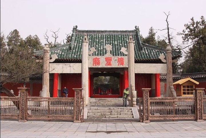 穿過第一進狹長的庭院,便是孔府中路的第二道大門,俗稱二門。門建于明代,門楣高懸明代詩人、吏部尚書、文淵閣大學士李東陽手書“圣人之門”豎匾,下有閥閱承托,門柱有石鼓夾抱。正門左右各有腋門一座,耳房一間。在封建社會,平時只走腋門,正門不開,以示莊嚴。