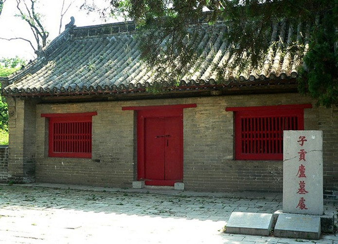 孔子墓西的3間西屋為子貢廬墓處。孔子死后,眾弟子守墓3年,相訣而去,獨子貢在此又守3年。后人為紀念此事,建屋3間,立碑一座,題為“子貢廬墓處。”享殿之后,另有一座灰瓦攢尖頂的方亭,稱“楷亭”。亭內石碑上刻著一棵古老的楷樹,即摹自其南側的“子貢手植楷”。相傳子貢奔喪來后,將一棵楷樹苗栽于其師墓旁,后成大樹。清康熙間遭雷火焚死,后人將枯干圖象刻于石上。