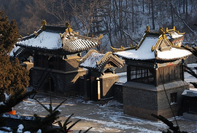 天地樓建在念佛堂前崖下,與牌坊相對,歇山式,磚木結(jié)構(gòu),面闊三間,正脊兩端有吻,斜脊磚雕跑獸。檐下有柱頭,補(bǔ)間五鋪?zhàn)鞫饭埃┎世L。底部是一個券門,門楣上磚雕二龍戲珠。券門外橫書“山門鎮(zhèn)靜”四個字。樓兩側(cè)各有一個角門。念佛堂是依而建,硬山式、磚木結(jié)構(gòu)。面闊五間,前有回廊。另修配房五間。