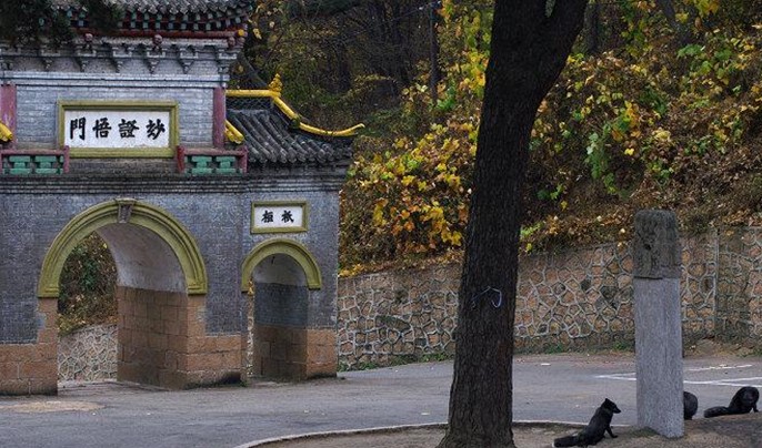 中會寺山門修建于民國23年(1934年),此山門是千山為數(shù)不多的排樓式的建筑,而在山門上有一副對聯(lián)寫道“為滌塵襟尋寶剎,愿新廟貌煥靈光”,在橫額上寫道“中會古剎”四個字,這也是中會一景,這副對聯(lián)意思是說人們遠(yuǎn)離塵世的喧嘩與煩惱,來到了僻靜的古寺,希望嶄新的廟宇能煥發(fā)出神靈的光茫,庇佑著虔誠的人們。兩側(cè)山門上有“林部”“哩汔”“祗垣”和“覺場”等,這些都是佛教用語,是指中會寺是僧人們練功和休息的精室美舍。“尚禮松”如一位忠誠的哨兵守衛(wèi)在山門前,又有如彬彬有禮的門童在歡迎諸位的到來,它已經(jīng)在這里有400年的日日夜夜。