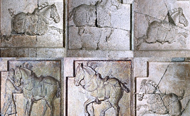 在祭壇東西兩廡房內置有6匹石刻駿馬浮雕像,馳名中外,曾有詩云:“秦王鐵騎取天下,六駿功高畫亦優?!边@是李世民自己選定的題材。他在隋亡以后,為統一割據的局面,鞏固唐王朝新建的政權,南征北戰,馳騁疆場,他騎過的六匹馬,聯系他的戰叻。據說當時擔任營山陵使、工部尚書、著名工藝家、美術家閻立德起圖樣,由筑陵石工中的高手雕鐫而成的。這六具石雕駿馬是在平面上起圖樣,雕刻人馬形狀的半面及細部,并使高肉突起,稱之浮雕,也叫“高肉雕”。每邊三具,皆背靠后檐墻而立。據記載,原石在每塊上角有歐陽詢書太宗自撰的馬贊詩,隨后另有殷仲容隸書刻于座上,這些今俱不可見,原詩收入《全唐文》中。六駿的名為“特勒驃”、“青騅”、“什伐赤'、“颯露紫”、“拳毛馬咼”、“白蹄烏”?,F存西安市碑林博物館,其中“颯露紫”、“拳毛馬咼”二駿,于1914年被盜運美國賓夕法尼亞大學博物館。昭陵六駿刻于貞觀十年,各高2.5米,橫寬3米,皆為青石浮雕,姿態神情各異,線條簡潔有力,威武雄壯,造型栩栩如生,顯示了我國唐代雕刻藝術的成就。在“颯露紫”中表現了唐太宗在與王世充作戰時為流矢所中,丘行恭進前為他拔箭那種親切形象。昭陵的這些石刻在品類、造型及題材上,既不取生前儀衛之形,也不用祥瑞、辟邪之意,獨具一格,所有石刻都是寫實,富有政治意義的不同凡響之作。