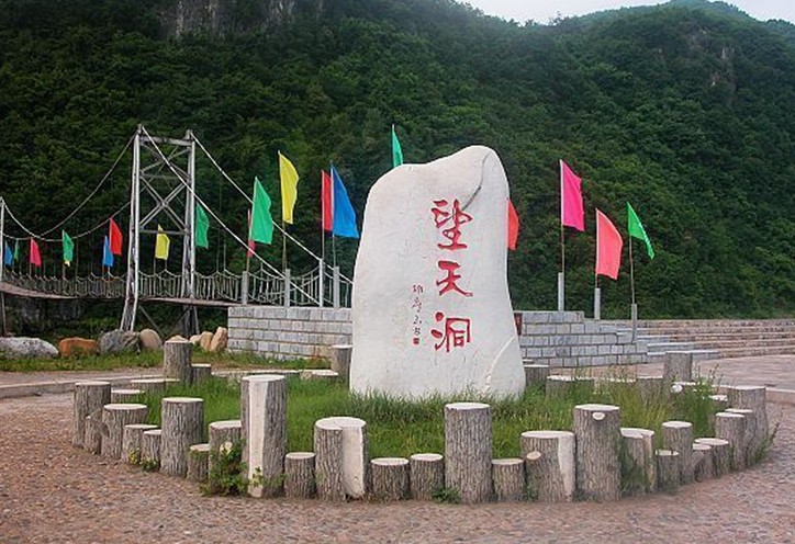 望天洞位于雅河鄉(xiāng)彎彎川村東70余米高的山頂上。該洞發(fā)育于20萬年前,洞總長(zhǎng) 7000余米,洞內(nèi)最大的廳6000余平方米,可容納萬人。全洞4大景區(qū)100余景點(diǎn)。洞內(nèi)的迷宮更為奇特,被稱為“北國第一洞,迷宮世無雙”。此洞兩個(gè)洞口并列,中間一道兩抱多粗的石梁。右側(cè)洞口有50平方米,洞口石壁上一只展翅昂首的大鳥,面向東方,形象逼真,名曰“鯤鵬朝陽”。左側(cè)洞口有35平方米。兩個(gè)洞口酷似一副巨大的眼鏡放在山巔。沿左側(cè)洞口石壁扶鐵欄踏石階經(jīng)“通天橋”,下行30余米,便是該洞的第一大廳--“聚仙廳”,寬闊高大,可納千人。回首仰望,兩道光柱直射廳中,使人有懷抱紅日、目接青天之感。若在春冬季節(jié)或雨、雪之后,廳內(nèi)云霧繚繞,從洞口向上升騰,云霧與洞口綠樹交相輝映,更是妙不可言。