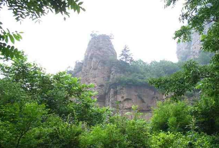 近處翠綠叢中,陡然兀立一尊高達(dá)20米的青色巨石,旁無(wú)所倚,大小兩塊毗連,形如母親摟抱孩子在依偎親昵,當(dāng)?shù)胤Q為“觀音石”,又名“觀音抱子”。此石頂部平坦,可坐三五人,因在龍頭下,故也有稱登龍臺(tái)的。
