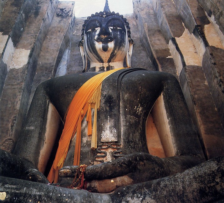 在果園和谷地的中間,是茂盛的大草原,草原延伸過一個(gè)山谷,與山谷平行的是一條發(fā)源于中國邊境的山上的河流,湄公河即由此流過。在一片芒果和椰子棕櫚的風(fēng)景之后,有一個(gè)聳立的高塔,帶著尖塔的圓屋頂連同巨大的雕像一起矗立在下層叢林中,幾乎覆蓋了一群更小的建筑遺跡,即一個(gè)古城所留下的歷史遺跡。矗立在城墻和護(hù)城河旁邊的建筑物便是神殿、寺廟和修道院,仿佛最初建造這個(gè)城市并且利用泥土和樹木做房屋的人們只想把他們的精神傳給子孫后代似的。素可泰是這個(gè)城市的名字,它在13世紀(jì)和15世紀(jì)時(shí)期是國家的首都,它的全部歷史便是泰國歷史的開端。公元13世紀(jì)中葉,隨著王國的建立,新的朝代開始了,泰國人逐漸壯大,泰國的領(lǐng)土擴(kuò)展到整個(gè)地區(qū),從緬甸(東南亞國家)一直到柬埔寨,向南部一直擴(kuò)展到馬來西亞半島那么遠(yuǎn)。在200年的時(shí)間里,素可泰一直是這種擴(kuò)展力量背后的精神支柱。公元15世紀(jì)的上半葉,這個(gè)城市開始走向衰落。取而代之的是南部的大城得以建立,逐漸成為國家的政治中心。