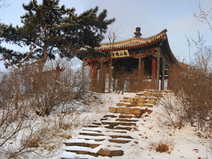 南山積雪亭位于山莊正北、青楓綠嶼南側(cè)的山頂上,是一處借景之作,為“康熙三十六景”第十三景。是山莊的制高點之一。 南山積雪亭為方形四角攢尖式敞亭,面積較大,在此可一覽眾峰。“南山積雪”是觀賞山莊初冬雪景為命題的一組苑景。塞北高寒,山莊之南,峰嶺環(huán)列,嶺上積雪經(jīng)久不消。登亭遙望,群山上的積雪“皓潔凝映,晴日朝鮮,瓊瑤失素”。直到初春時節(jié),仍是“不改冰霜積雪冬”的景象。