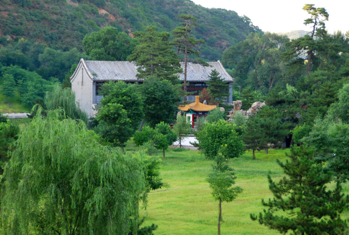 閣的東北部有水門與山莊水系相通,閣前池水清澈,人在閣前特定位置向池中望去,只見池中有一彎新月,隨波晃動,而天空卻是艷陽高照。原來這是造園家在池南的假山上,開出一個半圓形如上弦月的縫隙,利用光線,在水中形成下弦月的倒影,構成“日月同輝”的奇特景觀。水池南岸是一座造型別致的假山,怪石嶙峋,氣勢雄渾。假山占地約800平方米,用石3279立方米,由漿石和雞骨石等堆疊而成。假山石洞,前后各有兩門相通,結構也頗具匠心。洞內山石遮掩,可分廳、堂、窗、孔、穴等,洞壁用雞骨石鑲嵌,幽深曲折。有幾個大小不等的窗孔,透進幽幽的光線,使洞中的峭壁怪石若隱若現。山上橫嶺縱峰,溝橋崗壑,各自爭奇。有棒槌山、羅漢山、雙塔山等十大名山的縮影,更有“十八學士登瀛洲”的造型,還有仿米芾“寶晉齋”的園林布局。文津閣東為碑亭,四角攢尖頂,上覆黃琉璃瓦,內豎石碑一座,通高5.34米,碑正面鐫刻著乾隆題《文津閣記》,其余三面刻有乾隆作的3首詩。文津閣庭院,由粉墻圍繞,是山莊的園中之園。這組建筑,坐北朝南,依次布置著門殿、假山、水池、藏書樓、花臺、曲池、山石、月門。東側有碑亭和值房3間。閣前池水清澈,澄泓見底,水草叢生。池南假山呈半月形環抱池沼,版權所有山東聊城聊之旅國際旅行社有限公司,轉載必究!拱峙摟閣,疊石大多仿承德十大景堆砌,與山莊西山渾為一體。假山上有賞月的月臺,其西有趣亭(已不存)。假山上有磴道,下有洞府,入門進閣,必經此洞。石洞曲折幽邃,洞頂有一曲形石孔,光線漏射到池水中,恰如一彎新月,每當麗日當頭,水池中卻素月高懸,“抬頭看日,低頭觀月”,日月同輝,景觀絕妙,又為山莊一絕。