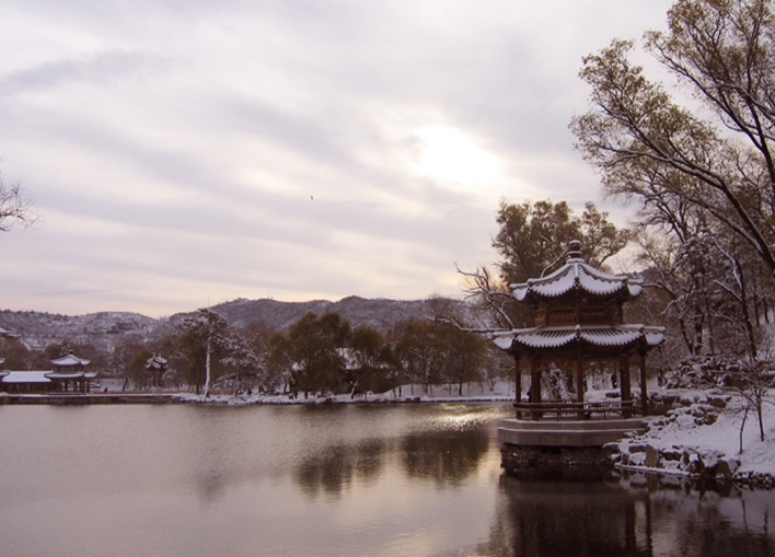 每逢中秋佳節之際,天高氣爽,登臨“月臺”賞月,但見園內,老樹蒼勁,枝杈縱橫。一輪明月冉冉升起,把一片銀輝灑向大地,山莊頓時銀裝素裹,更顯得清澈靜謐。文津閣假山的造型藝術,集中了米翁寶晉齋和范氏天一閣之長,運用傳統疊山技法,結合北方雄壯的特點,風格一反南方小巧玲瓏之態,而是雄偉、渾厚、氣勢磅礴的藝術作品。