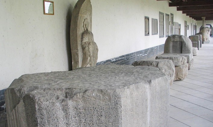 北魏阿彌陀佛說法石造像,高5.85米,現(xiàn)藏青島市博物館,俗稱丈八佛。庭院內(nèi)露天陳列許多珍貴文物,其中院東側(cè)護(hù)欄內(nèi),坐東面西、南北向并列4尊雕刻精美的北朝石刻造像和兩座石碑。中間兩尊石像高達(dá)一丈八尺,故稱“丈八佛”。佛像身軀微傾,雙目細(xì)長,彎如新月,目光下視,面含微笑,兩腳跌立于刻有蓮花的石座上,顯示了距今1400多年前北朝時代宗教藝術(shù)的偉大成就。
