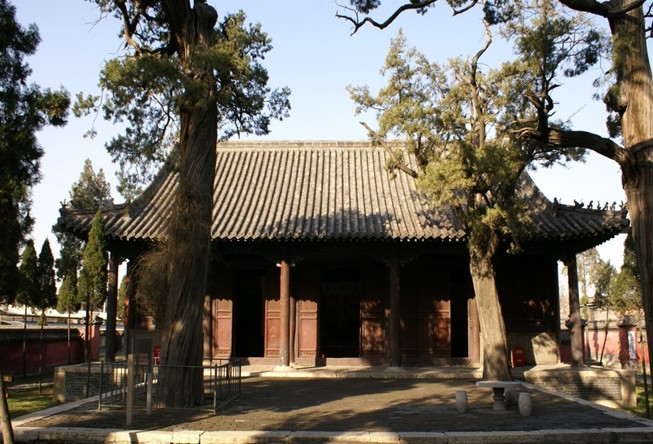 在孟廟寢殿前露臺和甬道之上,有3株古檜。據《三遷志》記載,為北宋宣和年間所植,距今已有近900年的歷史,是孟廟內最為古老的樹木之一,現依然青翠蓊郁,茁壯茂盛。奇妙的是其中一株古檜,不僅樹頂干枝造型為“鹿回頭”(林默涵語),頗為奇特,而且在樹干之上的鳥洞中寄生出數株枸杞,枝繁葉茂。夏秋之際,碧綠的枸杞葉簇擁著紅紅的果實,迎風搖曳,妙趣橫生,煞是喜人。