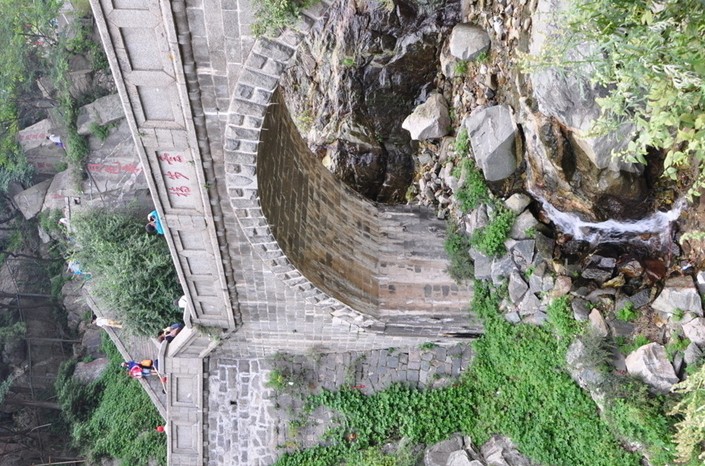 無論云步橋如何變化,云步橋景點的美麗是亙古不變的。明代陳鳳梧便有詩贊賞當時的“云步橋”:“百丈崖高鎖云煙,半空垂下玉龍蜒。天晴六月常飛雨,風(fēng)靜三更自奏弦。蒼水佩懸云片片,珠簾洞織月娟娟。晚山倒著肩輿下,回看斜陽景更艷。”云步橋北壁立如削,崖上石坪坦豁,傳宋真宗曾在此駐蹕,因名御帳坪。岱頂下諸水奔流而來,聚此處飛瀑下瀉,濺沫迸珠,生云化霧,蔚為壯觀,故又名飛瀑巖、天河、護駕泉。崖上有“紅橋飛瀑”、“霖雨蒼生”、“河山元脈”、“太古清音”等題刻。橋東有酌泉亭,又名觀瀑亭,是清末一泰安知縣所建。北側(cè)有聯(lián)“且依石欄觀飛瀑,再渡云橋訪爵松。”橋周圍有“月色泉聲”“云步躋天”、“氣象巖巖”等題刻50余處,真、草、隸、篆諸體薈萃,琳瑯滿目。