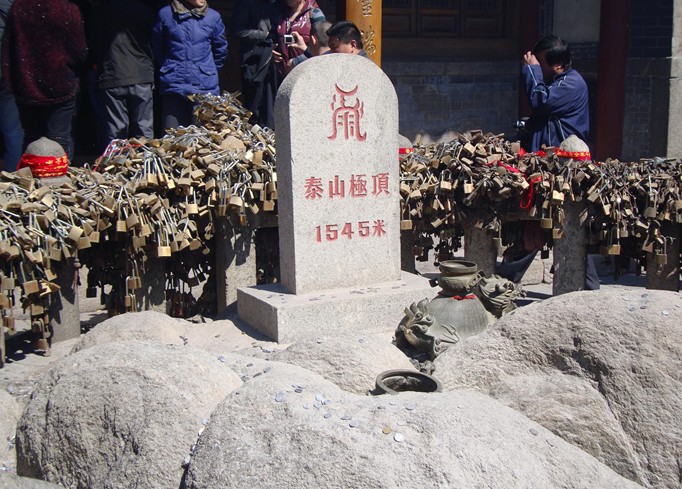 玉皇頂舊稱“太平頂”,也叫做“玉皇頂”,這里是泰山絕頂,是歷帝王登高封禪的地方。玉皇廟建于泰山的極頂,為泰山地勢(shì)最高的建造物,由山門、玉皇殿、迎旭亭、望河亭和東西禪房組成。主殿供奉玉皇大帝銅像,廟院中央有塊極頂石,極頂石上有通石碑,上刻著“泰山極頂”和“1545米”兩行字(實(shí)際高度1532.7米,國家測繪局二〇〇七年四月二十七日公布的數(shù)據(jù))。氣勢(shì)雄偉,拔地而起,有“天下第一山峰”之美譽(yù)。