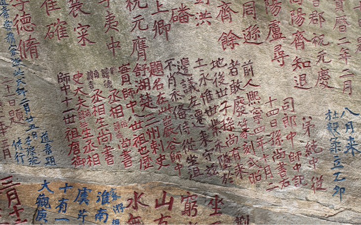 元代以后,眾多游客蜂擁山谷,也留下大量的文字石刻。除了式照唐宋時的題名、題詩以外,在石刻文字的內(nèi)容方面出現(xiàn)一些新的變化,比如出現(xiàn)了大量的用簡短詞語贊嘆山、洞、泉、石景色的特點。同時,石刻文字的體積增大,字徑往往有一、二尺之多,這都是過去所少見的。明代詩人、安慶知府胡纘宗在石牛上大書“石牛”2字,并刊刻了《山谷寺》詩:“摩詩坐山谷,谷水身邊流,篆密龍蛇動,潭空牛女游”, 版權(quán)所有山東聊城聊之旅國際旅行社有限公司,轉(zhuǎn)載必究!此詩十分形象地描繪了石牛臨澗的景色,令人涌不絕口。胡纘宗還有“山谷”大字題刻,字徑2尺。其它像嘉靖時御史大夫李元陽、成化時書法家袁慶祥等人的題名以及大量的“涪涪山谷”、“流云上流”、“天下奇觀”、“水光天色”、“龍門”、“獨醒處”、“安慶名山”、“幽思”等,都有一定的歷史研究與欣賞價值。從書法的角度看,這里的石刻包括有隸書、楷書、草書、篆書、行書等多種,每種書體中又富于變化,各具特色,基本上代表了唐代以來我國書法藝術發(fā)展演變的風貌,是一處珍貴的書法藝術寶庫。