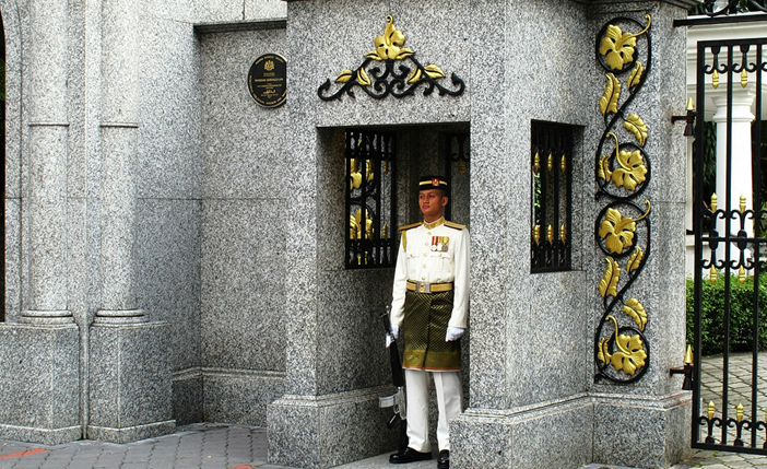 簡(jiǎn)單的皇宮門(mén)口是由一扇并不是很寬敞的鐵門(mén)與旁邊的小崗?fù)づc小門(mén)洞組成。僅僅就這一小片風(fēng)景,就讓游客迷戀不已。鐵門(mén)是用黑色作底色,襯以金黃色作為裝飾,典雅大方,從嚴(yán)肅中透出一種高貴。在鐵門(mén)的側(cè)邊的崗樓和崗樓旁的門(mén)洞中,各有一名哨兵站崗,在崗樓中的哨兵身穿白色上衣配有綠色前裙的制服,手持長(zhǎng)槍?zhuān)辉陂T(mén)洞中的哨兵,則穿一件紅色上衣,黑色長(zhǎng)褲,胯下騎一匹黑色高馬,威風(fēng)凜凜,常常吸引無(wú)數(shù)鏡頭。另外,不時(shí)在門(mén)口還會(huì)站有一排杠槍哨兵供人們拍照留念,閃閃的長(zhǎng)槍在陽(yáng)光的照射下與遠(yuǎn)處阿拉伯風(fēng)格的皇宮金頂遙相呼應(yīng),分外亮麗。