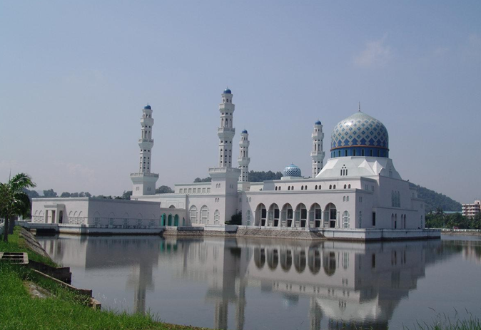哥達京那巴魯市立清真寺座落在里卡士灣畔(Likas Bay),是一座典型的當代伊斯蘭教建筑,是馬來西亞夕陽景觀最壯麗的清真寺之一。它建于里卡士灣的人造湖上,感覺有如浮在水面之上,因而得到“水上清真寺”的美稱。令人驚嘆的白色建筑物造型,與藍天完美的連成一體。清真寺于1997年建成,占地一公頃,可容納最多12,000名教徒祈禱。