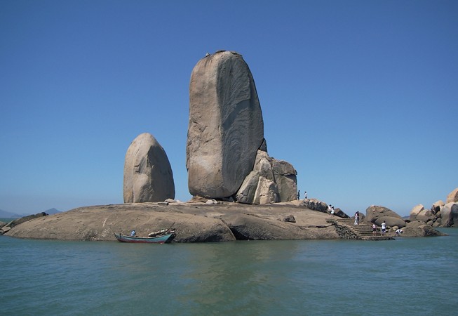 從看澳村岸邊坐渡船,十幾分鐘就到達礁石上,礁石底部是一組平坦完整的巖石。兩個石柱均由粗粒灰白色的花崗巖組成 東側的一個高達33米,胸寬9米,厚8米;西側的一個高17米,胸寬15米,厚8米。版權所有山東聊城聊之旅國際旅行社有限公司,轉載必究!兩個石柱的底部都是近似四方形體,直立在礁石上。據地質學家考證是世界上最大的花崗巖球狀風化海蝕柱。由于它的奇特壯觀,對游人有著強烈的震撼力和吸引力。建設部與中科院的專家稱之為:“壟斷性的世界級旅游資源。”明代旅行家陳第曾譽之為“天下奇觀”, 清朝女詩人林淑貞詩贊:“共說前朝帝子舟,雙帆偶趁此句留;料因濁世風波險,一泊于今纜不收.
