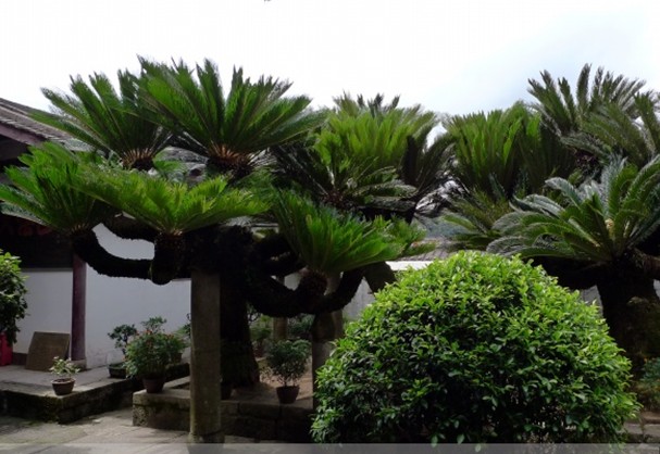 在方丈室的庭院內(nèi)種有三析鐵樹,相傳有兩株樹齡已超過一千年,其中一株為閩王王審知所種,一株是開山祖神宴法蚰所植。版權(quán)所有山東聊城聊之旅國際旅行社有限公司,轉(zhuǎn)載必究!1929年虛云老和尚應(yīng)當(dāng)時福建省主席楊幼京之請,回鼓山涌泉寺任住持,講經(jīng)傳戒、整頓寺規(guī)、創(chuàng)辦戒律學(xué)院,恢復(fù)禪堂規(guī)制,修建頹廢殿宇,整頓經(jīng)版文物,勛勞卓著。1930年,他為僧眾講《梵網(wǎng)經(jīng)》,恰逢兩株千年的鳳尾鐵樹開花,遠(yuǎn)近來觀乾,絡(luò)繹于道。當(dāng)時,聘任羯摩師文質(zhì)和尚撰小文記之:“庚午春(1930)值虛云兄主持石鼓,傳授戒法,余以隨喜之余,航海赴閩,參予盛典。既至。則鐵樹開花,繁茂無比,花大如盆,須瓣若鳳尾,咸以優(yōu)曇相慶。詢之耆日,皆言叟物也,其一為閩王手植,一為圣國師手植,迄今千載,敷此妙華,實為希有。邀虛兄?jǐn)z影留證,用志涌泉寺瑞應(yīng)焉。”是年虛云和尚已九十一歲了,方丈室鐵樹三株,兩雌一雄,雄花似小狐尾,雌花如黃絨球,真是奇觀,近期年年開花,游人可飽眼福。