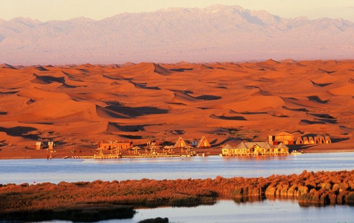 騰格里沙漠是中國第四大沙漠,也是現(xiàn)在流動速度最快、周邊人口密度最大的沙漠,是沙塵暴的主要發(fā)源地之一。月亮湖是騰格里腹地的純天然湖泊,也是一個(gè)完全處于原始狀態(tài)的沙漠綠洲。月亮湖有三奇:一奇是形狀酷似中國地圖。站在高處沙丘一看,一幅完整的中國地圖展現(xiàn)在眼前,蘆葦?shù)姆植几菍⒏魇^(qū)一一標(biāo)明。二奇是湖水天然藥浴配方。面積三平方公里的湖水富含鉀鹽、錳鹽、少量硭硝、天然蘇打、天然堿、氧化鐵及其它微量元素,與國際保健機(jī)構(gòu)推薦藥浴配方極其相似。湖水極具生物凈化能力,能迅速改善,恢復(fù)自然原生態(tài)本色。三奇是千萬年黑沙灘。在長達(dá)一公里、寬近百米的天然浴場沙灘,推開其表層,下面是厚達(dá)十多米的純黑沙泥,其質(zhì)地遠(yuǎn)超死海的黑泥,更是天然泥療寶物.
