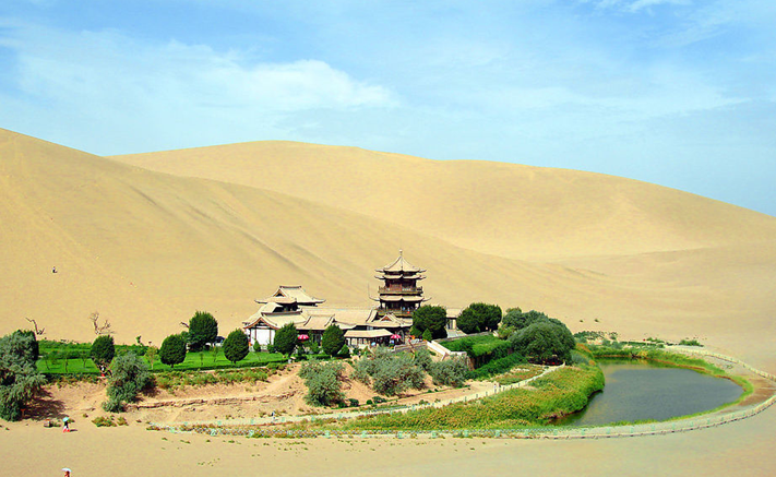 月牙泉位于敦煌市西南5公里處,是一處神奇的漫漫沙漠中的湖水奇觀。鳴沙山下,泉水形成一湖,在沙丘環抱之中,酷似一彎新月而得名月牙泉。月牙泉,古稱沙井,俗名藥泉,泉邊蘆葦叢生,水中魚兒自在,胡楊沙棗綠樹成蔭,羅布麻、枸杞等藥用植物豐茂,亭臺樓榭古香古色,春夏季節百花盛開,夏秋季節梨果飄香。自漢朝起即為“敦煌八景”之一,得名“月泉曉徹”。月牙泉南北長近100米,東西寬約25米,泉水東深西淺,最深處約5米,彎曲如新月,因而得名。一灣清泉,漣漪縈回,碧如翡翠。
