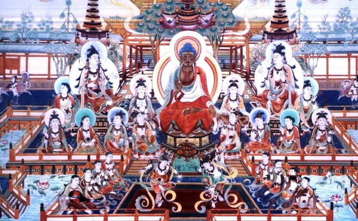7窟前室東西壁南側(cè)繪兩幅《接引佛》。正中兩幅各4.5平方米的《說法圖》十分復(fù)雜,天上畫日月、翼人,靈山雷音寺中佛祖高坐蓮臺說法,左右兩側(cè)長廊下站立眾弟子,兩排使樂、天人奏樂,樂器有長蕭、排蕭、長笛、古箏、胡琴、銅磐、鐃鈸、云鑼、手鼓、大鼓等,是研究民族樂器發(fā)展歷史的重要資料。佛蓮臺前八德池中蓮花盛開,小樓內(nèi)僧人手扶橫木在撞鐘。人物栩栩如生,多達84身。圖中的大雄寶殿、亭臺樓閣結(jié)構(gòu)復(fù)雜,雄偉壯觀,是研究西夏民族建筑藝術(shù)風(fēng)格的珍貴資料。