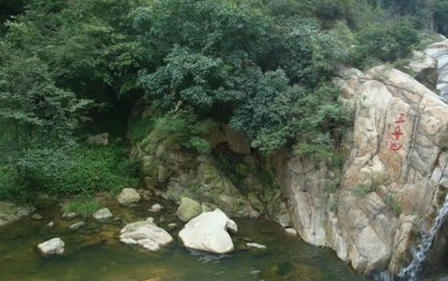 谷中怪石林立,一條小溪自谷中流過。在溪谷下游有三級斷崖,形成三級瀑布,水流直下,濺起萬朵銀花。在瀑布左上方,有一塊巨石疊立,高達10余米,遠(yuǎn)望之,恰似一嫻淑的仙女在俯首凝思,人稱王母石。 相傳古時瑤池王母東巡泰山途經(jīng)此地,見此處幽靜,便飄然臨下,于池中沐浴,流連忘返,化而為石,常駐池邊。后人便將王母沐浴處稱為“王母池”,并在池旁半山腰建起王母廟。廟對面有一棵重約10噸的碩大石桃,上刻桃一熟,歲九千。