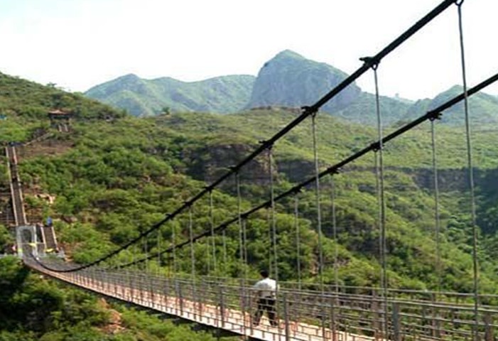 過(guò)了孝子祠,梓童湖如一面明鏡呈現(xiàn)在人們面前,在湖水上空架設(shè)了一座獨(dú)特的連接孝子祠與鬼谷祠的鐵索木橋,該橋全長(zhǎng)50余米,寬2米有余,跨離水面10余米的兩岸懸崖之間,地部整齊地齊地橫臥5條大鐵鏈,上鋪木板,兩側(cè)設(shè)有固定拉鏈扶手,人行走在橋上好像步入顫悠悠、輕飄飄的云霧之中,思維升華,如登仙境。