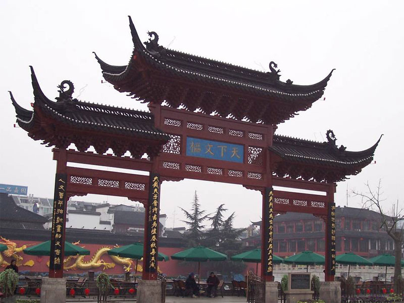 秦淮河是古老的南京文化淵源之地,而內秦淮河從東水頭至西水關全長4.2公里的沿河兩岸,從六朝起便是望族聚居之地,商賈云集,文人薈萃,儒學鼎盛,素有“六朝金粉”之譽。自六朝至明清,十里秦淮的繁華景象和特有的風貌,曾被歷代文人所謳歌。 夫子廟位于秦淮河北岸,原是祀奉孔子的地方,始建于宋代景祐元年(公元1034年),是就東晉學宮舊址擴建而成。元代為集慶路學,明代為應天府學,清代將府學 遷至城北明國子監舊址,這里便成為江寧、上元兩縣縣學。咸豐年間毀于兵火,同治八年(公元1869年)重建??谷諔馉帟r被日軍焚毀。古時立學必祀奉孔子,其各地的孔廟,屬于國家祀典內容之一。所以孔廟的特點是廟附于學,和國學、府(州)縣學聯為一體。廟的位置或在學宮的前部,或偏于一側。