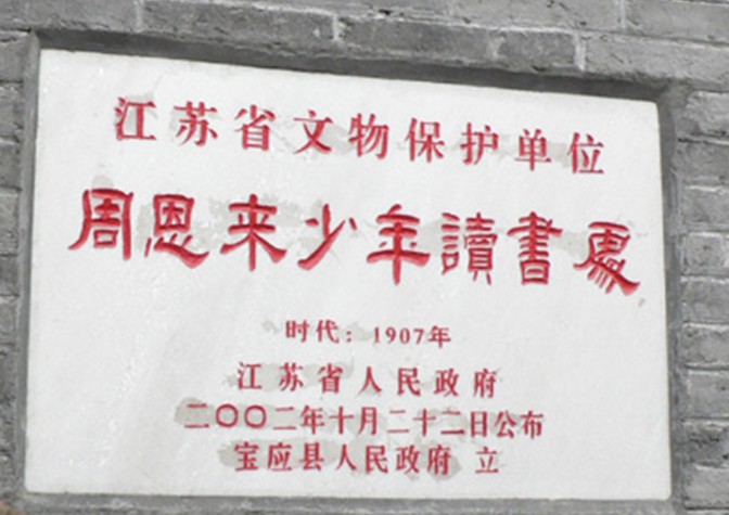 周恩來少年讀書處位于江蘇省寶應縣城縣南街水巷口3號,原為周恩來同志的外祖父陳沅的宅第,整個建筑為清代風格,分東西兩個院落,共十八間房屋,建筑面積500平方米,占地面積700多平方米。1996年寶應縣政府組織全面修繕,恢復原貌,1998年3月5日周恩來同志誕辰100周年正式對外開放。