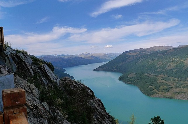 觀魚亭建于海拔2030米的哈拉開特(蒙古語意為駱駝峰)山頂上,與湖面的垂直落差達(dá)600多米,因處于觀察“湖怪”的最佳位置,故得名觀魚亭。去觀魚亭有兩條路可供選擇:一條是乘汽車從山后繞行到山腰;另一條是從湖出水口山前專為爬山者鋪設(shè)的石階盤旋步行而上。