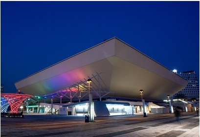 表演場-面積:41米x41米,最多可設位:12,500 ,。地面:混凝土,地面負荷:每平方米1,800千克,樓高:23米,設備:各式組合式表演臺,高懸中央的電視放映系統,各式新型的舞臺及技術設備 。
