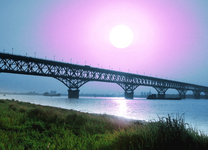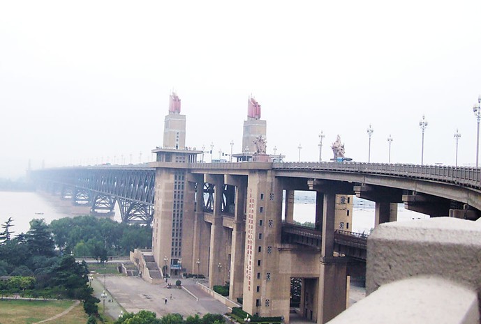 南京長江大橋,位于南京市西北面長江上,連通市區與浦口區,是長江上第一座由我國自行設計建造的雙層式鐵路、公路兩用橋梁。上層的公路橋長4589米,車行道寬15米,可容4輛大型汽車并行,兩側還各有2米多寬的人行道;下層的鐵路橋長6772米,寬14米,鋪有雙軌,兩列火車可同時對開。其中江面上的正橋長1577米,其余為引橋,是我國橋梁之最。正橋的路欄上,公路引橋采用富有中國特色的雙孔雙曲拱橋形式。公路正橋兩邊的欄桿上嵌著200幅鑄鐵浮雕,人行道旁還有150對白玉蘭花形的路燈。