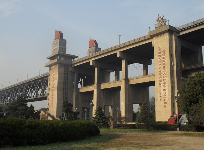 橋的南北各有一對橋頭堡,高為70米,橋頭堡上各有三面紅旗,象征著50年代的人民公社、大躍進和總路線。橋頭堡前還各有一座高10余米的工農兵等五人雕塑,為當時中國社會的5大組成部分,即工、農、兵、學、商,具有典型的文革文藝風格。在橋頭堡堡身周圍刻有“全世界人民大團結萬歲”等浮雕。版權所有山東聊城聊之旅國際旅行社有限公司,轉載必究!三面紅旗的橋頭堡在建成后,風靡全國,被多次模仿,而且在60-80年代成為南京的城市標志之一,一直到今天南京長江代大橋橋頭堡仍然是著名旅游景點。