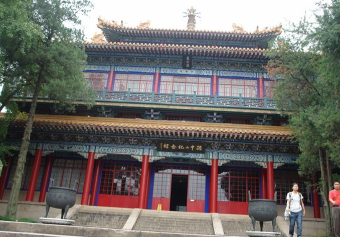 孫中山紀念館有多處,這里主要介紹南京孫中山紀念館。孫中山紀念館,原名藏經樓,位于中山陵與靈谷寺之間的密林中,是一座仿清代喇嘛寺的古典建筑。主樓高20.8米,頂上蓋綠色琉璃瓦,屋脊為黃色琉璃瓦,正脊中央飾有紫銅回輪華蓋,梁、柱、額枋均飾以彩繪。樓內珍藏孫中山先生的經典著作和奉安照片等珍貴史料。樓前廣場正中的花臺上豎有一尊高2.6米的孫中山先生全身銅像。