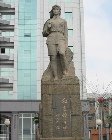 紅色娘子軍紀念雕像將紅軍女戰士腳穿草鞋、肩背竹笠、風塵仆仆的一代巾幗英雄的氣概充分展現。