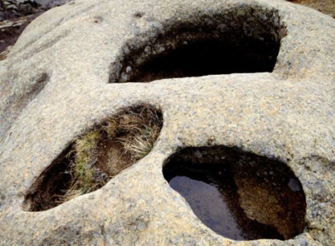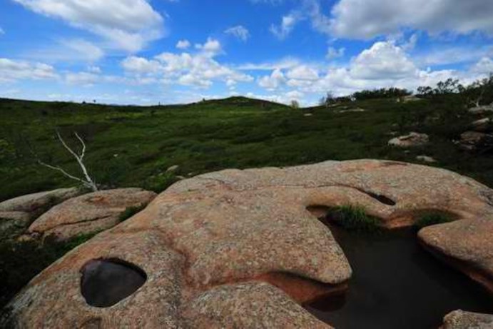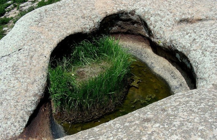 青山自然保護(hù)區(qū)位于海拔1574米的青山山體上,在山頂頂峰分布著各種各樣的冰臼,其平面上多數(shù)呈圓形、近圓形、橢圓形和不規(guī)則的形狀。有的象葫蘆,有的象梅花,有的象瓜子。一般冰臼口稍小,中下部較大,底多較平或呈鍋底微凹。形體“似臼”、“似盤”、“似盆”、“似匙”等,可以說(shuō)應(yīng)有盡有。其中較深的冰臼多呈口小、肚大和底平特征??诓可暇墡в腥笨冢ɑ蜷_(kāi)口),缺口有大有小,有深有淺。一般臼口寬約0.3~2米,深0.1~2米左右。最大的直徑達(dá)10.5米,深4.5米;最小的只有幾公分,似一般鈕扣大小。據(jù)調(diào)查統(tǒng)計(jì),在方圓不到2平方公里的范圍內(nèi),就有大小不一的冰臼1000多個(gè)。有的冰臼光潔如洗,無(wú)任何殘留物和充填物,但很多冰臼中,都填滿風(fēng)塵黃土物質(zhì),已長(zhǎng)滿花、草或喬木、灌木,形成大小不同的“天然盆景”,置于堅(jiān)硬平坦的花崗巖山脊上,十分壯觀,給人極大的神奇感和奧秘感。
