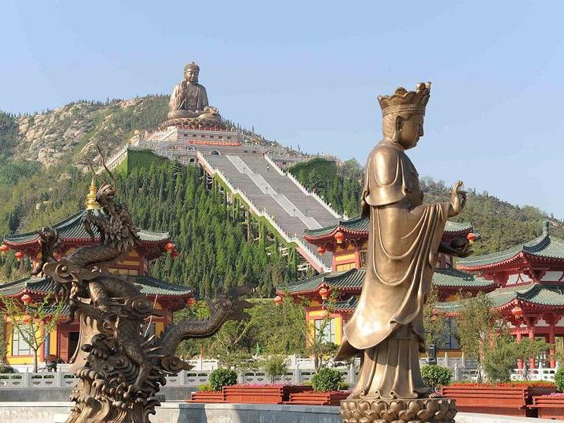 釋迦牟尼坐佛造像,選材錫青銅鑄造,大佛高38.66米,重380噸。由232件佛體、108塊蓮花瓣、302個發髻、共642塊,錫青銅鑄件組合而成,堪稱目前世界第一大銅鑄佛。大佛右手作“施無畏印”,左手作“施與愿印”, 版權所有聊城聊之旅旅行社有限公司,轉載必究!表示佛為眾生拔除苦難,給予幸福。蓮花座下建有功德堂、萬佛殿和佛教歷史博物館。萬佛殿內陳列著9999尊造型逼真,栩栩如生的金銅佛像,與大坐佛共同構成了萬尊佛像的宏大陣容,佛教歷史博物館內展示了佛教文化興起興盛的歷史記載,館內陳列展出了釋迦牟尼佛舍利等數十件文物和佛教文化藝術珍品。南山大佛熔古今中外佛像鑄造藝術的精華,使古老的青銅鑄造藝術和現代科技成果于一體,展現了佛教文化和現代文明的完美結合。