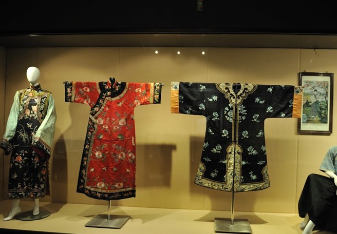 分“遵神循禮——錦衣繡服——家常日用”三部分,以絲綢服飾與歷代微縮服裝人物模型、圖板、象征性復(fù)原場(chǎng)景相結(jié)合的形式,形象地詮釋絲綢在古代社會(huì)的功用,展現(xiàn)戰(zhàn)國(guó)至清代流行的襖裙袍服、補(bǔ)服、龍袍等宮廷華服和家常日用繡品。