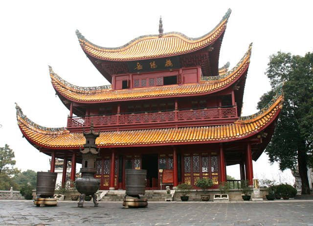 岳陽(yáng)樓始建于公元220年前后,其前身相傳為三國(guó)時(shí)期東吳大將魯肅的“閱軍樓”,西晉南北朝時(shí)稱“巴陵城樓”,中唐李白賦詩(shī)之后,始稱“岳陽(yáng)樓”。此時(shí)的巴陵城已改為岳陽(yáng)城,巴陵城樓也隨之稱為岳陽(yáng)樓了。千百年來(lái),無(wú)數(shù)文人墨客在此登覽勝境,憑欄抒懷,并記之于文,詠之于詩(shī),形之于畫(huà),工藝美術(shù)家亦多以岳陽(yáng)樓為題材刻畫(huà)洞庭景物,使岳陽(yáng)樓成為藝術(shù)創(chuàng)作中被反復(fù)描摹、久寫(xiě)不衰的一個(gè)主題。登岳陽(yáng)樓可瀏覽八百里洞庭湖的湖光山色。岳陽(yáng)樓在湖南岳陽(yáng)洞庭湖西岸,相傳三國(guó)時(shí)此地就有閱兵樓,唐代以來(lái)詩(shī)文更盛,如李白:“樓觀岳陽(yáng)盡,川回洞庭開(kāi)”;杜甫:“昔聞洞庭水,今上岳陽(yáng)樓”等。宋代重修岳陽(yáng)樓,范仲淹曾撰《岳陽(yáng)樓記》,樓名更傳揚(yáng)天下。宋岳陽(yáng)樓僅從現(xiàn)存南宋岳陽(yáng)樓圖可略見(jiàn)一斑。現(xiàn)存岳陽(yáng)樓重建于清光緒五年(1879),在岳陽(yáng)西城墻上,坐東向西,面臨洞庭湖,遙見(jiàn)君山。樓平面矩形,正面三間,周圍廊,三層三檐,通高近20米。屋頂為四坡盔頂,屋面上凸下凹,為中國(guó)現(xiàn)存最大盔頂建筑,覆黃琉璃瓦,翼角高翹。樓前兩側(cè)左右與樓品字并列,有三醉亭和仙梅亭作為陪襯。