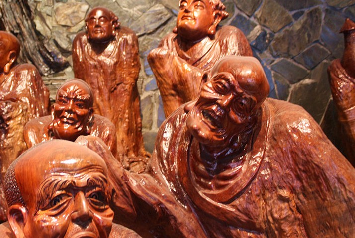 七、五百羅漢簡介:這套巨型根藝五佰羅漢,是徐谷青大師經(jīng)過十余年的精心準(zhǔn)備,花巨資收集全國各地千年龍眼木等根樁創(chuàng)作,風(fēng)格獨(dú)特,氣勢恢弘,既有佛的神秘,又與人生百態(tài)相映,他們?nèi)宄扇骸⒒蚪活^接耳、或悲或苦、或孤座獨(dú)立,或慈眉善目,或閉目凝神,全神貫注,妙相莊嚴(yán);有的胸腹袒露,似笑欲語;有的拄杖持珠,合十?dāng)偸郑械耐诙蟊牵煺鏍€漫,有的豐額寬肩,悠然自得;有的禿頭長耳,滿臉胡須;有的大腹便便,雙耳垂肩,有的捧腹搔耳,笑容可掬;有的誦讀經(jīng)卷,念念有詞;有的伸足屈膝,打坐箕踞…………,在傳統(tǒng)的雕刻技法中融匯了現(xiàn)代藝術(shù)的創(chuàng)新理念,使羅漢系列情表于外,意韻其中,典雅且通俗,使根雕藝術(shù)和佛教文化珠聯(lián)璧合,是世界上最大的一套根雕五百羅漢造像,正在申報(bào)世界吉尼斯世界之最,